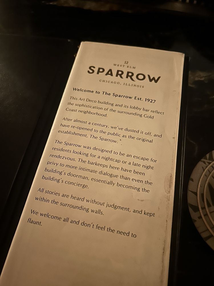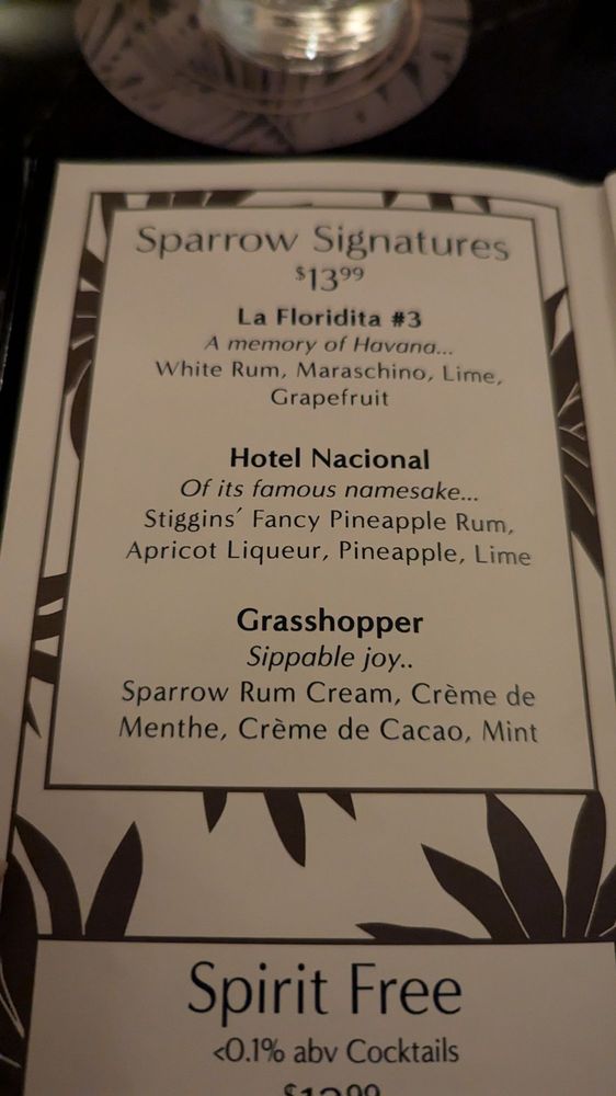 Sparrow, located at 12 W Elm St in Chicago, offers a sophisticated dining experience with a variety of amenities. From intimate and romantic settings to happy hour specials, full bar, and outdoor seating, Sparrow caters to different preferences. The extensive liqueur list includes options like Amaro Abano, Campari, and Chartreuse, while their cocktail selection features unique concoctions like the Grasshopper Sparrow and El Presidente. Sherry lovers can enjoy selections like Lustau 'Los Orcos' Amontillado and Valdespino 'Isabela' Cream. With options for walk-ins, reservations, and dog-friendly outdoor seating, Sparrow is a versatile spot for gatherings or a night out. The diverse menu and inviting ambiance will leave you coming back for more.